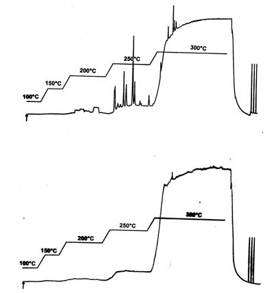 - The bottom one shows a normal run, with increasing level of the baseline at temperatures over 200 0C.